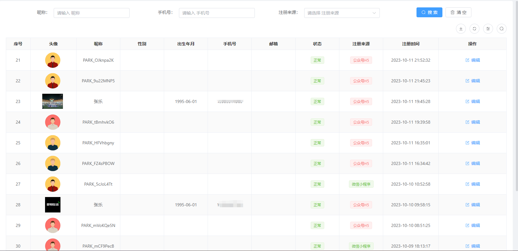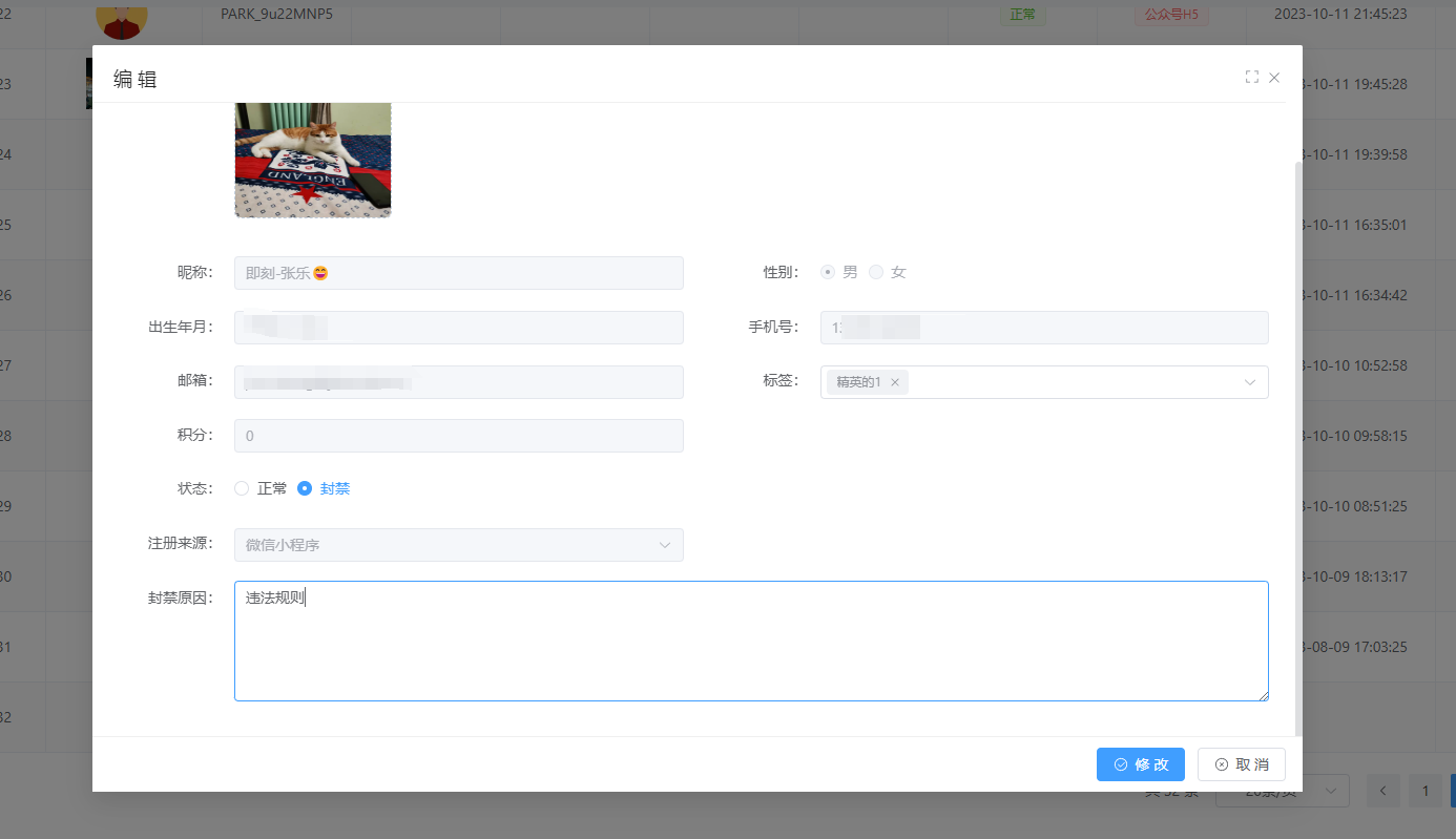 ### 一、功能简介 **查询注册用户列表、封禁用户、增加标签** ### 二、菜单路径 **用户管理 > 注册用户管理** ### 三、使用指南 1、可以根据昵称、手机号、注册来源来查询用户列表  2、支持封禁用户
