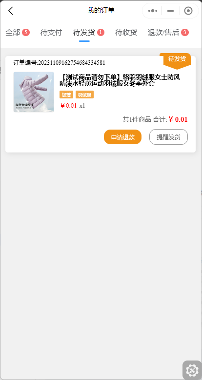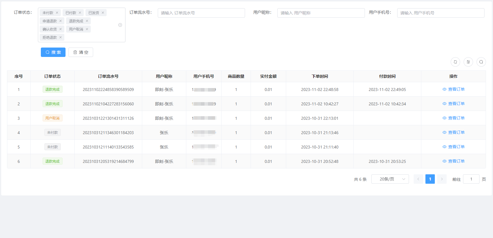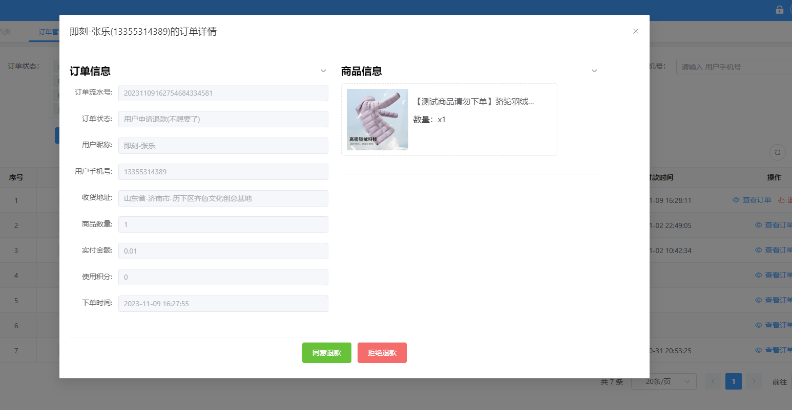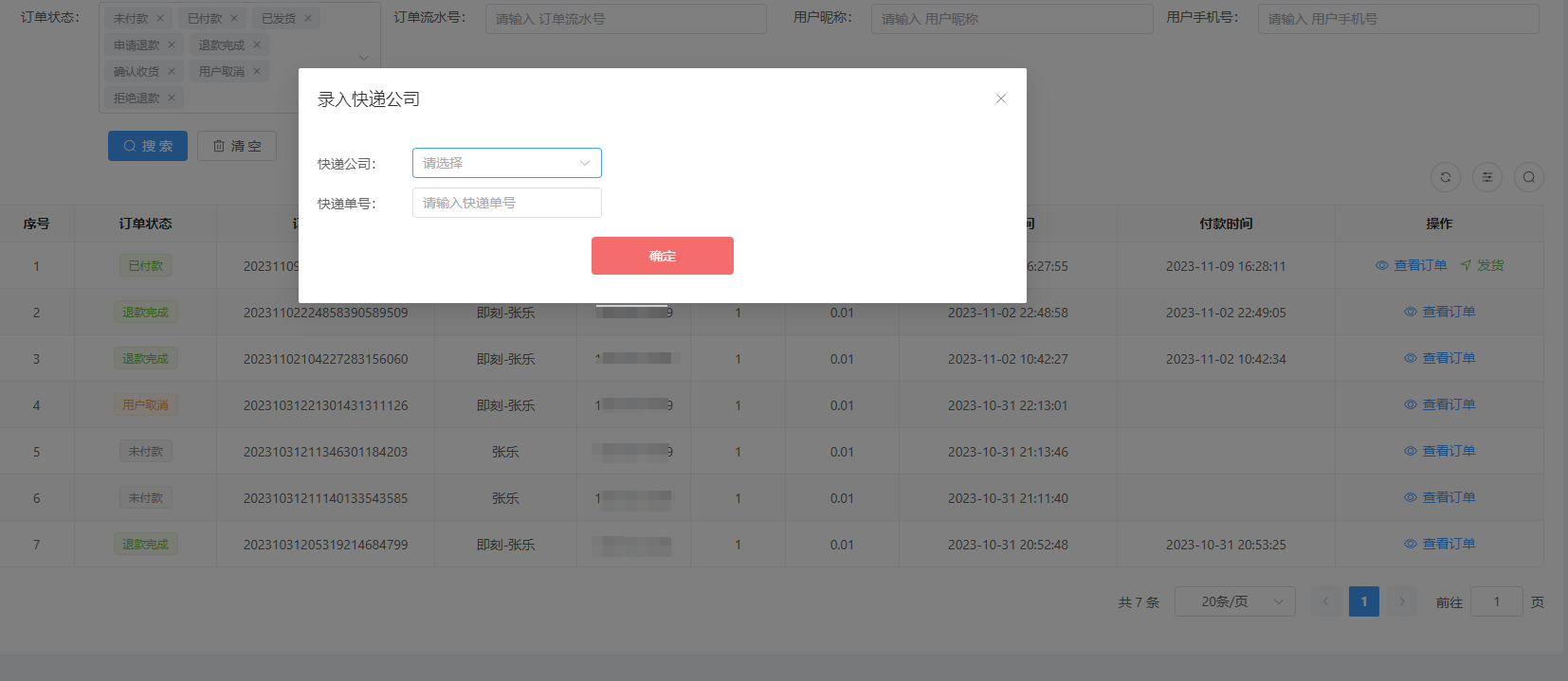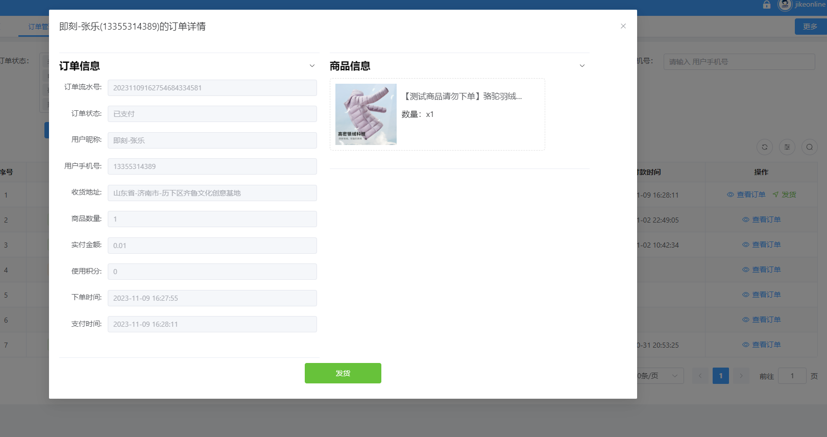 ### 一、功能简介 管理员录入商品信息 ### 二、菜单路径 积分商城>商品管理 ### 三、使用指南 #### 1、列表查询优先查看已付款的订单,如需查看其他类型订单,请选择订单状态  #### 2、订单详情  #### 3、订单发货 选择快递公司,录入订单号  #### 4、订单退款 订单退款的按钮在用户端,用户主动发起退款申请,管理员审核退款申请