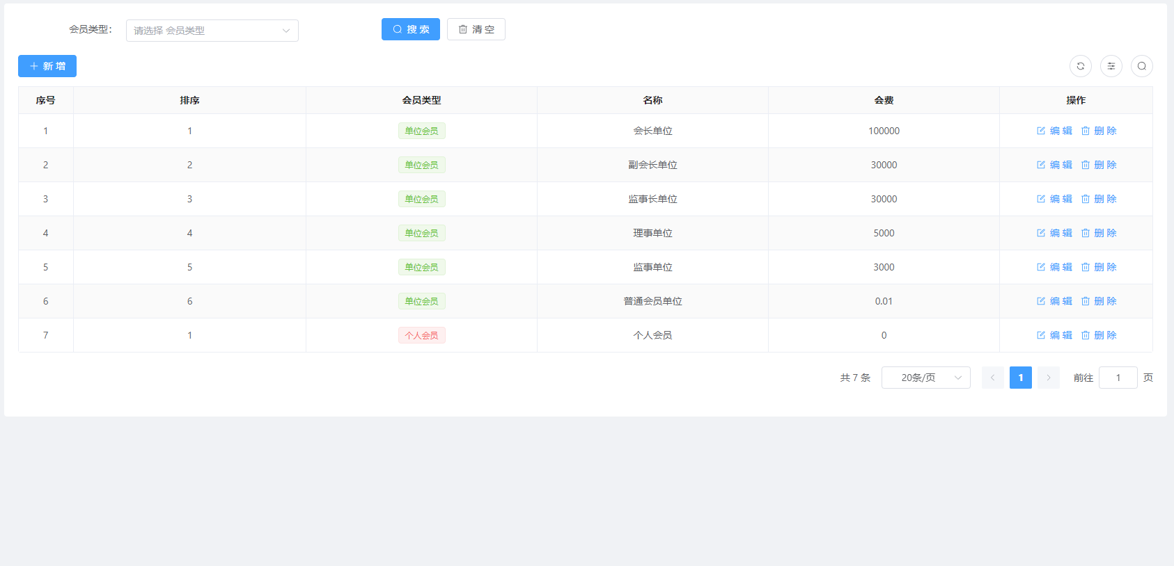 ### 一、功能简介 提供会员入会会员类型,可以设置会员会费,支持在线缴费 ### 二、菜单路径 会员管理>会员类型管理 ### 三、使用指南 1、可以按照会员类型(单位、个人会员)来设置不同的会员类型,可以设置名称、会费以及排序