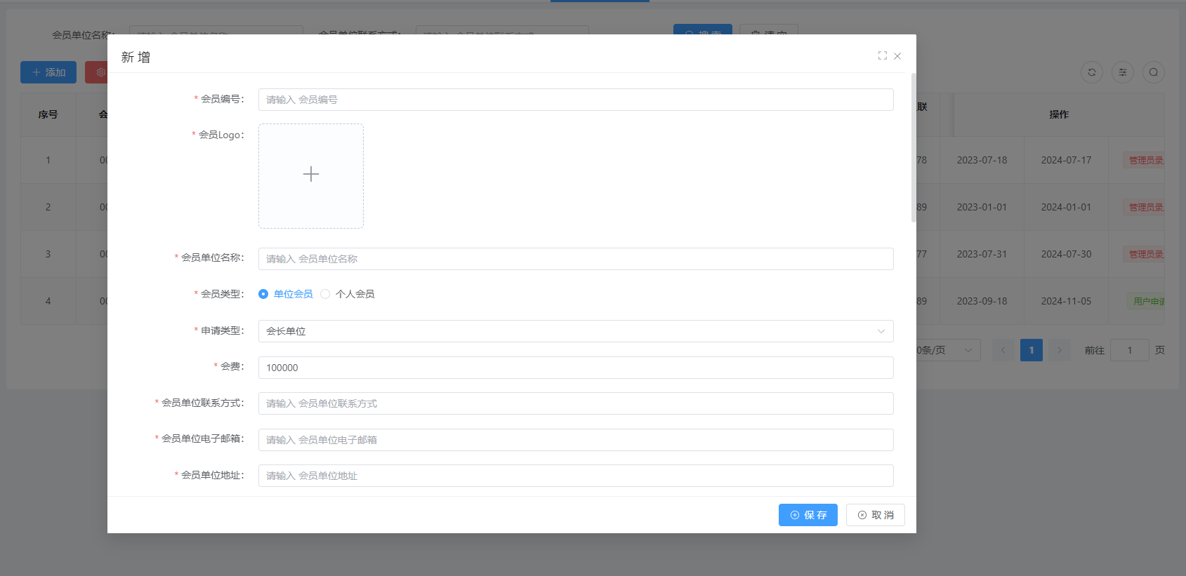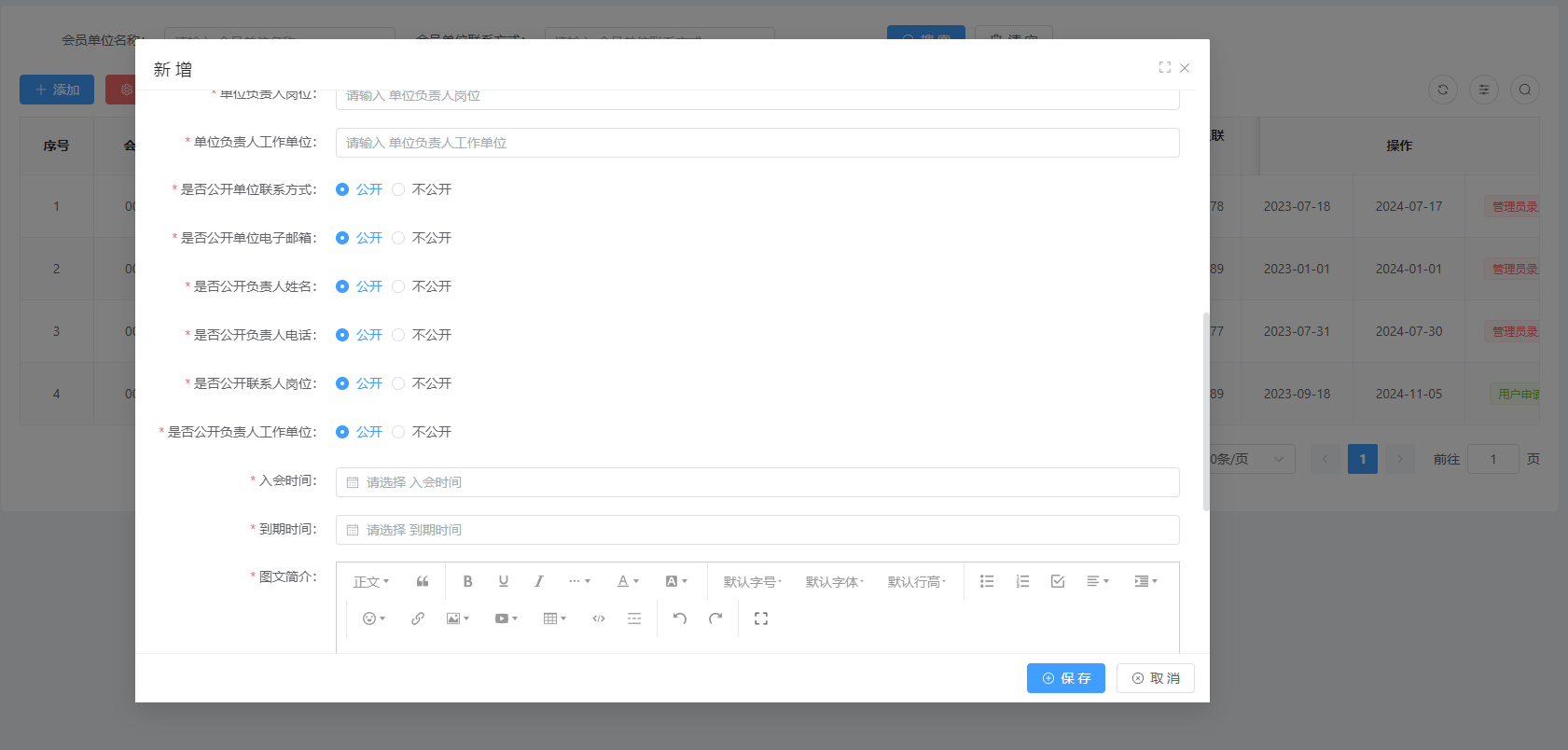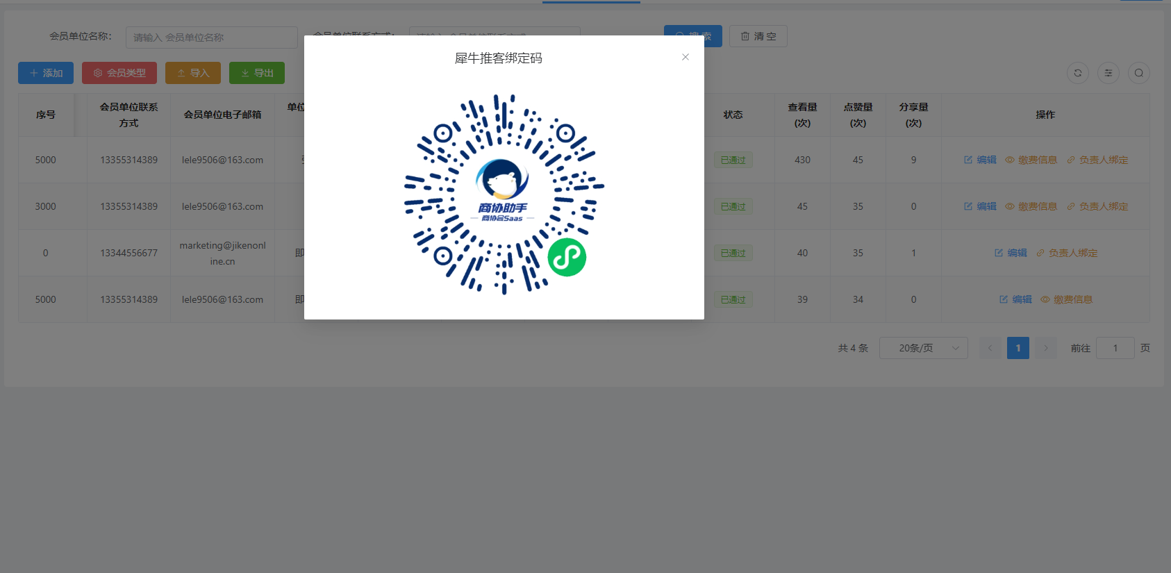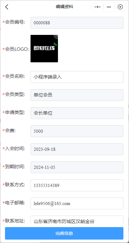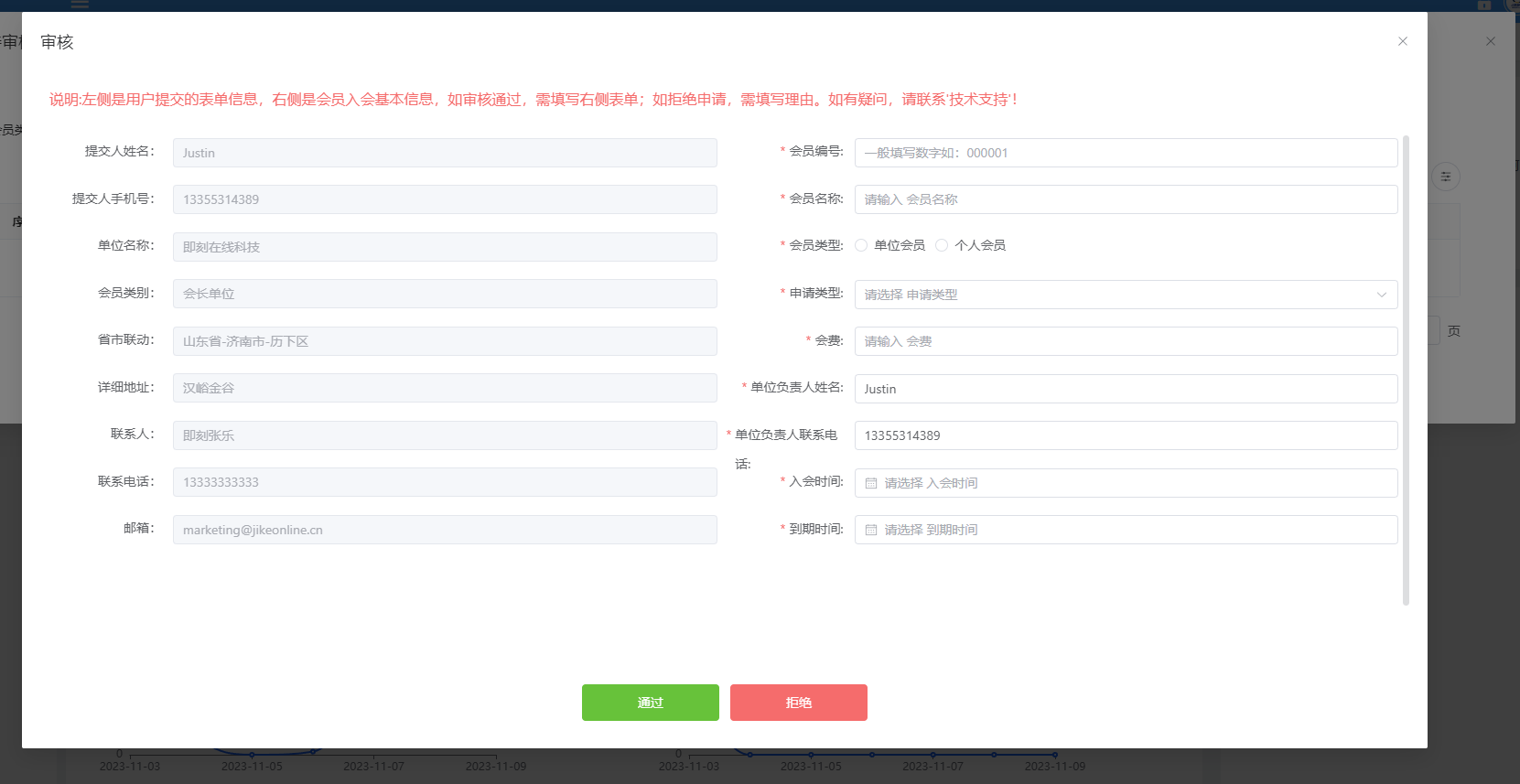 ### 一、功能简介 录入会员信息 ### 二、菜单路径 会员管理>会员信息管理 ### 三、使用指南 #### 1、新增按钮(管理员录入,会员信息直接展示在前端小程序页面),标红的星号为必填项  由于一些会员的负责人姓名、手机号等信息需要不对外展示,此功能可以设置对外公开不公开,不公开的信息,小程序端不予展示。  #### 2、列表状态说明 会员状态分为:“待审核”、“待缴费”、“审核退回”、“已过期”、“已通过”、“即将过期(剩余天数:XX)”  #### 3、按钮功能说明 ①、缴费信息:用于查看在线缴费的详情,缴费分为在线缴费和对公打款,对公打款需要管理员审核通过之后,会员状态才可以置为已通过状态;  ②、负责人绑定:用于处理“管理员录入”的数据,此功能是绑定注册用户成为此会员单位的管理员,绑定成功之后,注册用户可以在小程序端缴费、维护会员单位的基本信息用于展示;  小程序会员单位管理员信息维护入口:“我的”--“协会资料”  ③、数据展示:已通过和管理员录入的会员单位才会显示在小程序会员列表页面 <img src="/media/202311/2023-11-09_150745_6470150.6215104635463429.png" style="width:50%;height:auto;"><img src="/media/202311/2023-11-09_150821_7291070.04953653255417645.png" style="width:50%;height:auto;"> ### 四、用户会员申请审核 #### 1、系统首页-代办事项-入会审核  #### 2、审核状态 ①、通过:右侧的表单标红的星号数据必须由管理员录入并填写 ②、拒绝:必须填写理由,拒绝通过后,申请用户可以修改后继续提交  ### 五、特殊说明 #### 1、系统提供了会员到期前10天、5天、3天短信自动提醒,到期时短信也会提醒; #### 2、系统提供管理员审核结果通知,以小程序订阅通知的形式下发;