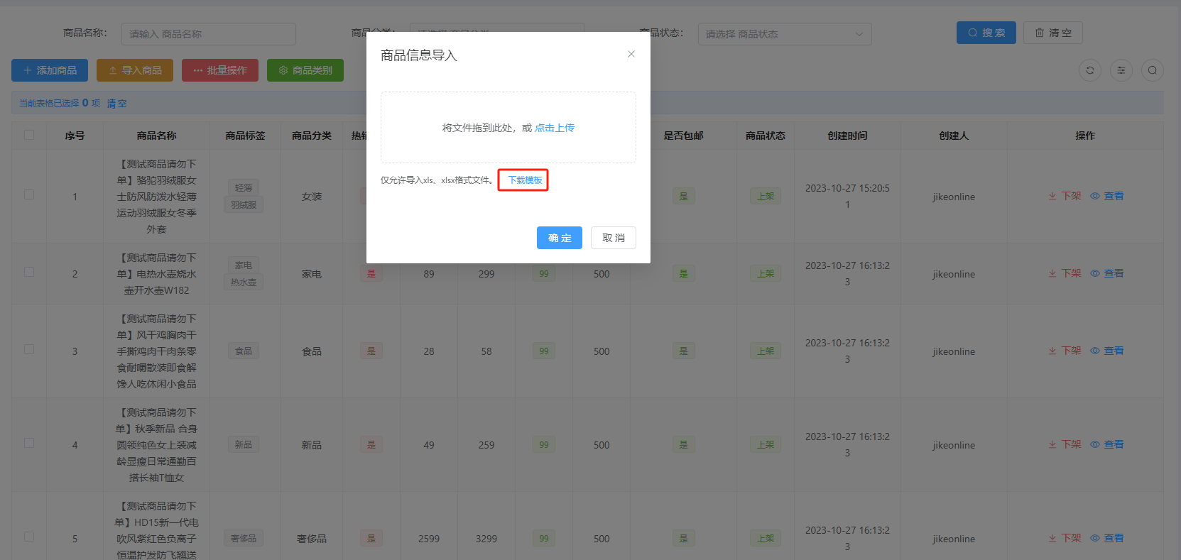 ### 一、功能简介 管理员录入商品信息 ### 二、菜单路径 积分商城>商品管理 ### 三、使用指南 #### 1、添加商品,按照表单内容添加信息  ##### ①、是否热销产品,体现在小程序页面首页  #### 2、导入商品,按照下载的模板填充商品信息  #### 3、批量操作,支持批量上下架,批量改库存  #### 4、如果想修改商品的某个信息,需要先下架之后,然后在进行修改、上架 ### 四、小程序展示