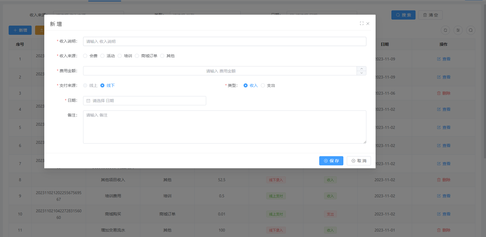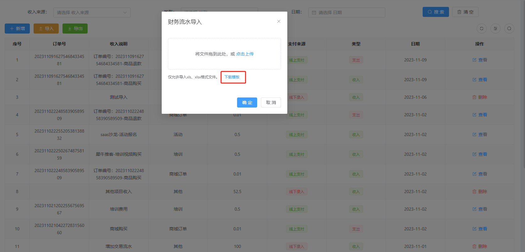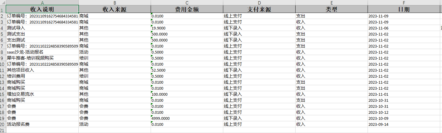 ### 一、功能简介 **查询财务支出流水、线上自动统计,支持的类型有:会员会费缴纳、活动报名费用、培训课程购买费用、商城订单** ### 二、菜单路径 **财务管理 > 流水明细** ### 三、使用指南 1、新增线下支出流水  2、支持财务流水导出  3、支持财务流水导入,按照下载的示例模板进行数据填充