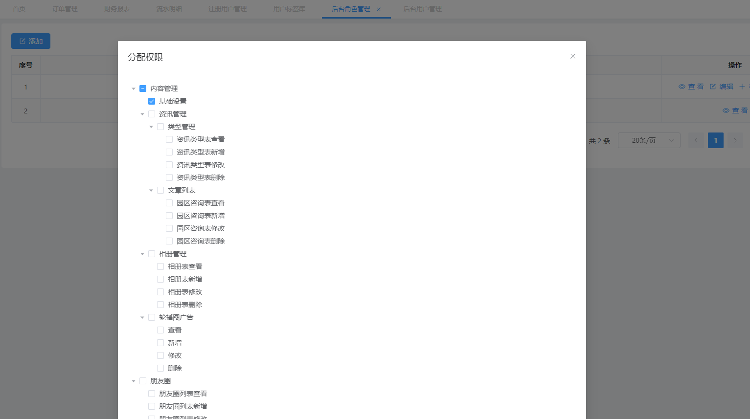 ### 一、功能简介 **分配不同角色不同权限** ### 二、菜单路径 **用户管理 > 后台角色管理** ### 三、使用指南 1、添加不同角色  2、添加的角色设置不同的权限,勾选菜单之后,点击最下面的“更新”按钮