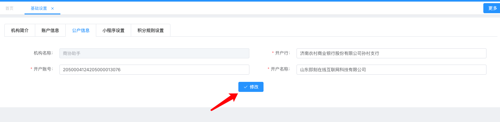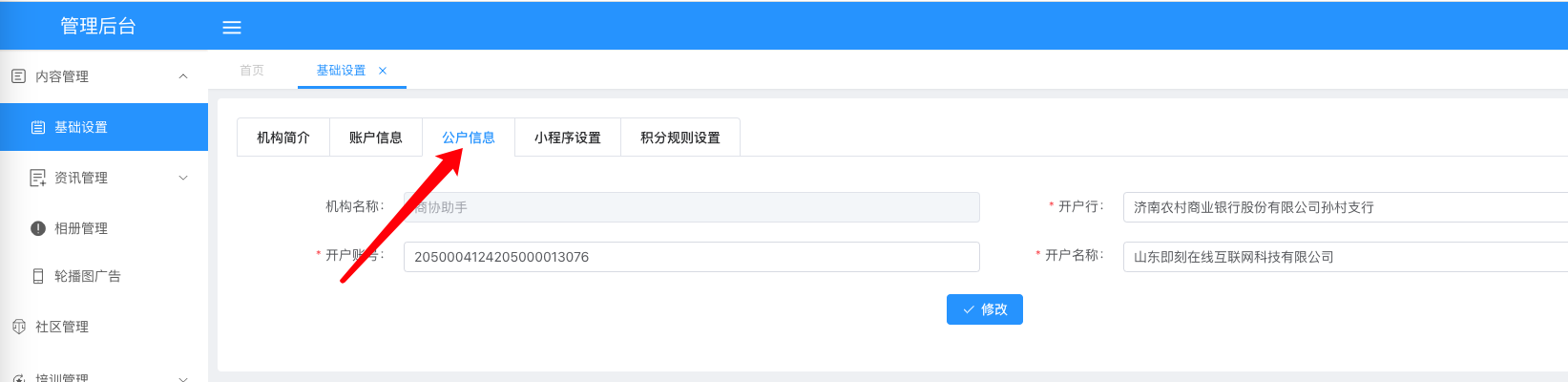 ### 一、功能简介 **设置协会公户信息** ### 二、菜单路径 **内容管理 > 基础设置(公户信息)** ### 三、使用指南 #### **1、切换菜单,点击公户信息选项卡**  #### **2、填写公户信息后,点击修改按钮进行保存**